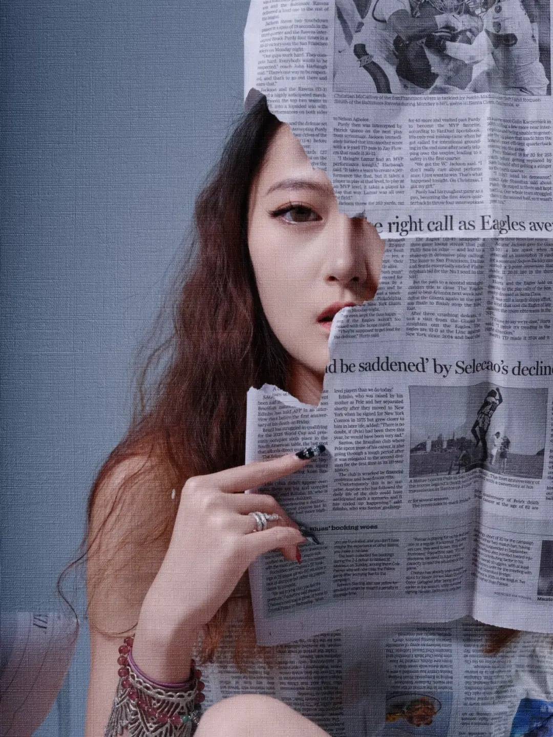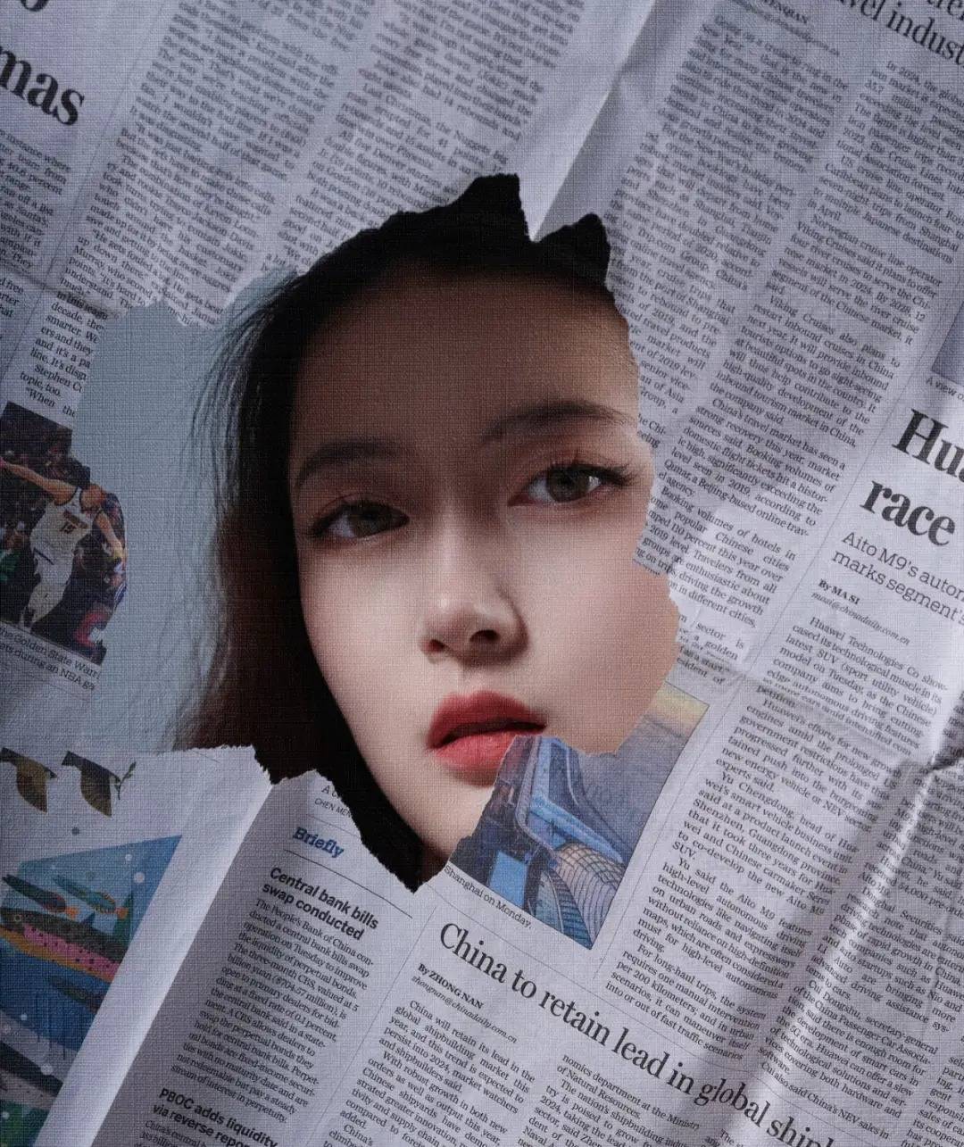 这是一个非常有创意的脸部特写拍法。取一张报纸,在边上撕开一部分,然后将它举到脸前,露出你的半张脸或一只眼睛。这个“画框”能瞬间将所有的视觉焦点都集中在你的眼神上,充满了艺术感和神秘感,高级又有创意。