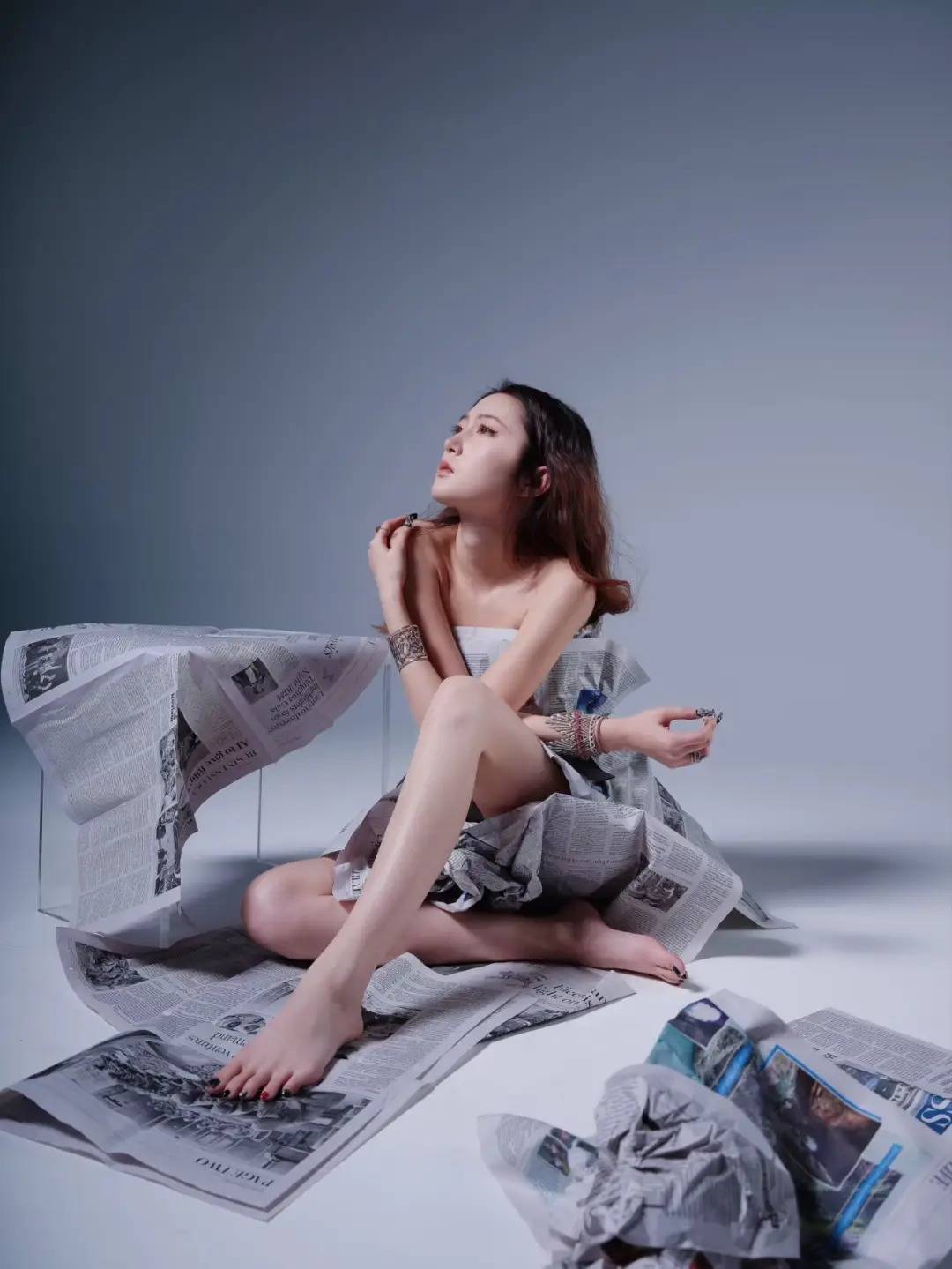 首先,让我们来营造一个充满戏剧感的环境。将大量的报纸随意地揉搓、铺洒在地板上,并将其做衣服穿身上,打造一片“报纸的海洋”。然后,你可以随意地躺在其中,舒展身体,让身体的曲线和报纸的褶皱形成有趣的对比,画面充满了故事感。