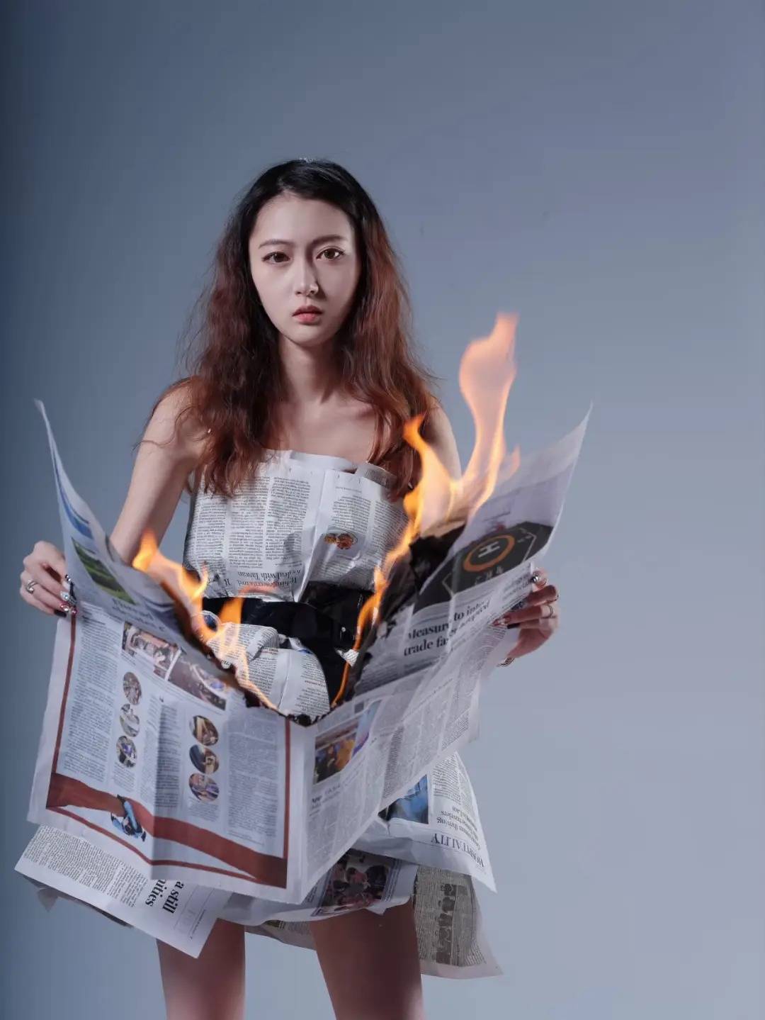 这个姿势的视觉冲击力极强,燃烧的火焰象征着毁灭与新生。手持燃烧的报纸,眼神坚定地看向镜头,能拍出充满力量和态度的作品,仿佛在宣告一种“浴火重生”的决心。